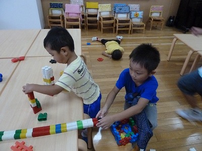 でも元気に教室で新聞紙遊びやブロック遊びなど