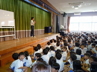 サマースクール2日目。あいにくの雨模様でしたが、子ども達はそんなのお構いなしに、元気いっぱい過ごしました。講堂で楽しい、楽しいスイカ割り♪ 「えいっ!」とスイカをめがけ、棒をふりおろしていましたよ★その後はみんなで甘~いスイカをおいしくいただきました♪