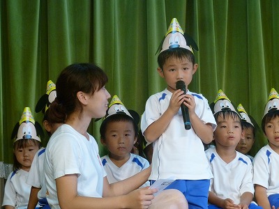 久しぶりの登園夏期保育1日目です!8月のお誕生日会をしました。みんなひとつお兄さん、お姉さんになって少し誇らしげでした。どの子もみんな頑張って発表できました♪