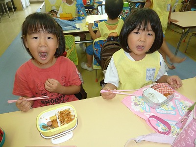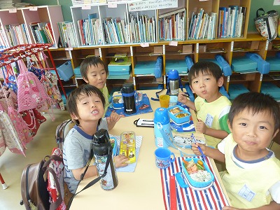 ホームクラスの楽しみな時間のひとつ。お家の人からの愛情たっぷりのお弁当♪「今日はぼくの大好きなおかずだぁ!」みんなおいしそうにほおばっています。最後の片付けまでバッチリです。「明日はなにが入っているかな~?」