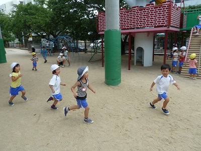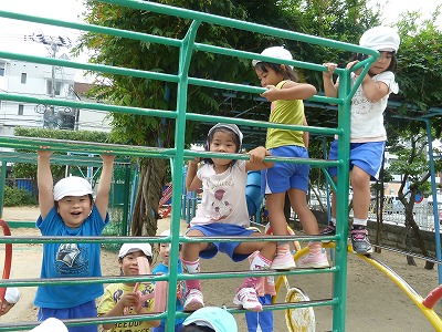 お外で元気いっぱい遊んだ後は、みんなで遊具を片づけます。