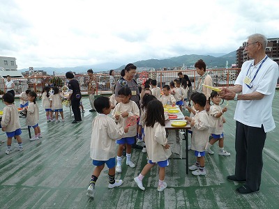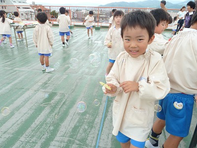 先週の金曜日、年長組に桜寿会の方々が来てくれました。おりがみ遊びをしたり、シャボン玉遊びをしたり、みんな楽しそうにすごしていました!最後の歌のプレゼント、喜んでもらえてよかったです☆