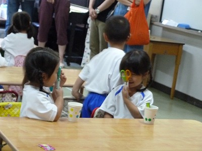 「先生!見て、上手に書けたよ。」と、花丸をもらって満足そうな子ども達。
