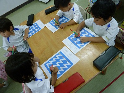 線からはみ出ないように ゆっくりゅつくり・・・ どの子も丁寧にかたつむりのはやさで書きます。