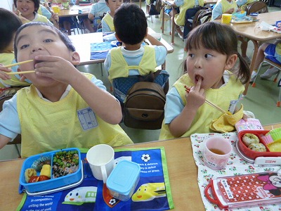 お弁当の中身を楽しそうに見せ合いっこしていました。