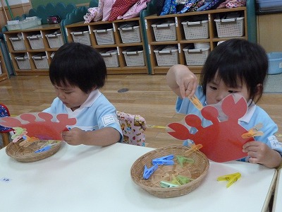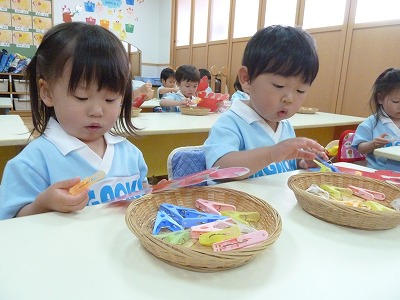 最年少組は、洗濯ばさみを使って、かにさんの足を作りました☆