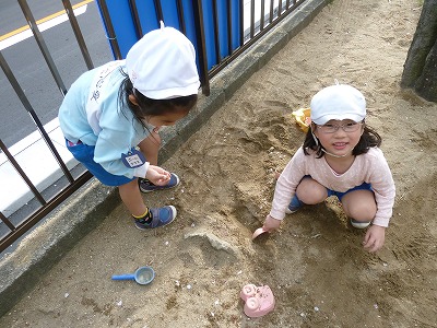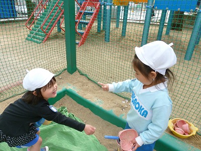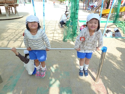 「先生鉄棒見ててね♪」「今日はお菓子やさんなの!!」と園庭は