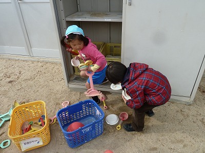 今日の外あそびでは、元気いっぱい遊んだあと進んで片付けをしてくれる