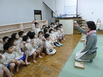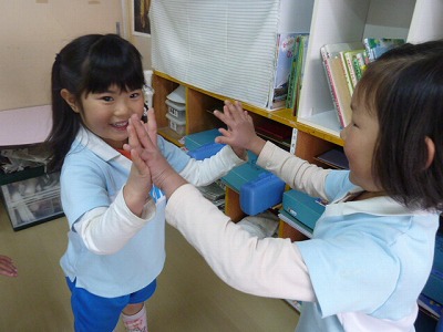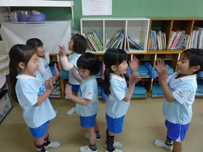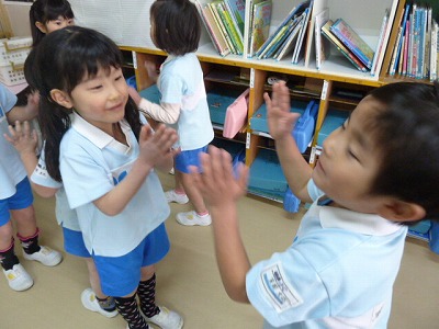 わらべ歌にふれてきたリトミック。今回は「あんたがたどこさ」です。手拍子をしながら「さ」のところで、友達と手を合わせます。この時間以外にもやりたいと言うほど、楽しんで取り組んでいます。