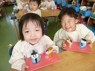 もうすぐひなまつりですね。最年少組ではひな人形製作の仕上げをしました★