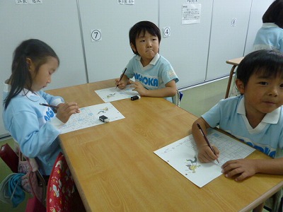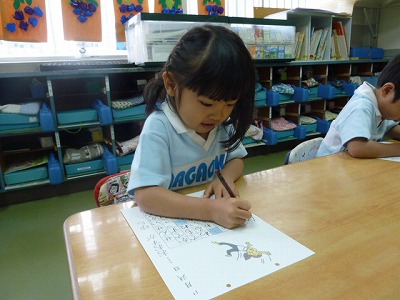 幼稚園では毎日『書く』活動が入ります。鉛筆の持ち方にも気をつけながら一生懸命 取り組んでいます。終わった後は、『先生できました!!』ととっても嬉しそうです♪