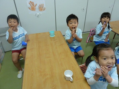 昼食後には歯磨きの指導を行います。鉛筆のように歯ブラシを持ち、 音楽に合わせながら、楽しく磨きます。『シャカシャカ』という音を聞かせてね というと、しっかり磨くようになりますよ!!