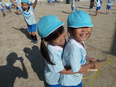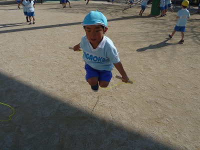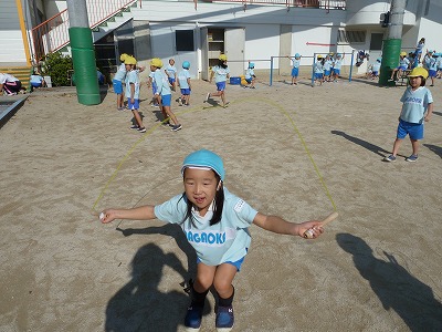 年中になって始めたなわとび遊び。体育レッスンの時間だけでなく、外遊びの時間にも 自分のなわとびを持って楽しく練習している子が沢山です。少しずつ上手になってきて いますよ♪