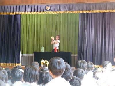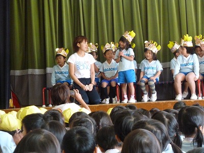 12月の誕生会が開かれました(^▽^)                                                       今日は年中さんの発表です。 ちょっぴり緊張しましたが、マイクを持って前を向いてがんばって発表できましたよ 。                                                                                         先生からのプレゼントはなんと・・・マジックです!! ペットボトルの中の水の色が色んな色に大変身しましたよ☆
