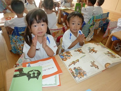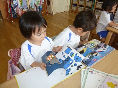 ゆめ組の子ども達は、絵本が大好きです☆ 今日もコスモス文庫の時間を楽しみにしていましたよ♪ 「この本にしたよ」「小さい絵本がいいなぁ」みんな好みの絵本を見つけて嬉しそうです。 おうちでお母さんに読んでもらおうね!