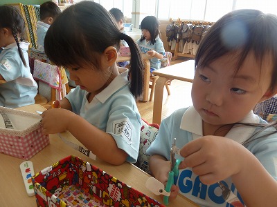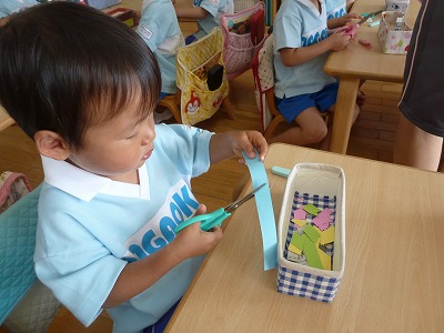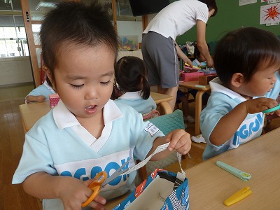 最年少の子ども達、はさみも少しずつ使うのが上手になってきました☆ 今日は新聞紙と画用紙をチョキチョキ……。 怪我をしないように、よ~く見て使おうね♪