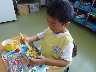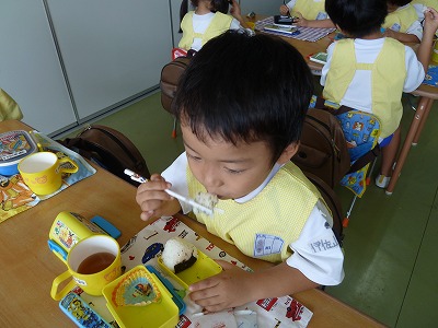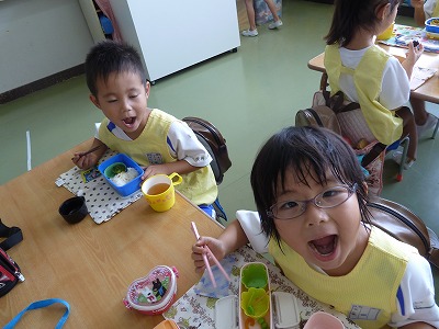 楽しみなお弁当の時間♪ 朝から「お弁当、まだかなぁ~」とにこにこ顔で待っています! お母様の愛情たっぷりのお弁当は格別ですよね!! 左手をそえて、正しいお箸の持ち方でいただきまーす☆ いつもいつもありがとうございます!