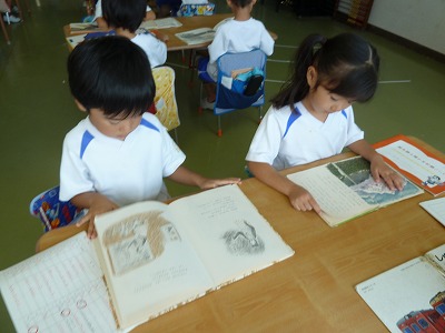 心が落ち着く読書の時間☆ 左手そえて、指でなぞって… 自分が選んだ絵本を真剣に読んでいます。 本読みは頭の栄養☆ 毎日読んでどんどんかしこくなってほしいですね♪♪