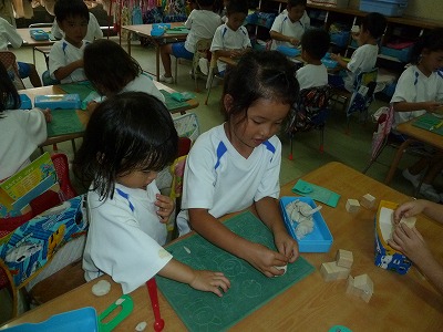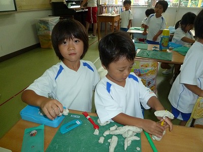 昨日は雨が降ったので外あそびはできませんでした。 そのかわりに・・・年少さんのお部屋に年長さん・年中さんが遊びにきてくれました。 「かっこいい恐竜はこうやってつくるんだよ」 粘土遊びがいつも以上に楽しくなりました♪