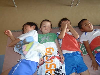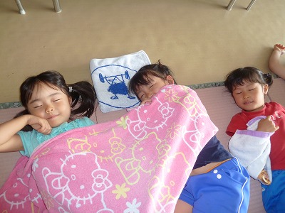 た~っぷり遊んで、た~っぷりお弁当を食べた後は、 みんなで仲良くお昼寝タイム♪ お友達と寄り添いながら楽しい夢を見ているのでしょうか? しっかり休憩をとって、午後も元気に遊んでいました☆