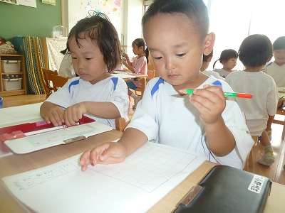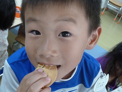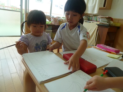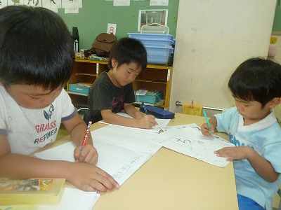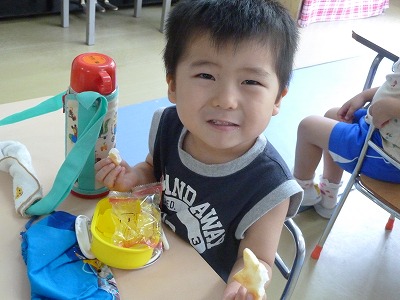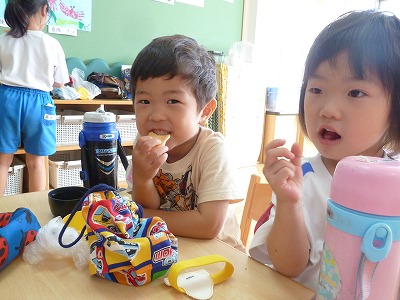 今日も、暑い1日!!でも、子どもたちは元気いっぱいです。 日記・ホームワークと夏休みに入っても、規則正しく取り組んでいます。 お昼寝の後は、待ちに待ったおやつの時間♪何が入っているのかドキドキ・ワクワク!!大きな口でもりもり、食べる姿はとっても可愛いですね♪