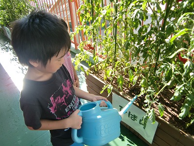 幼稚園で育てているトマト!よーくみると赤いトマト、緑のトマトがありますね。「こどものときは緑で、大きくなったら赤くなって、食べられるサインなんだよ♪」と話をすると、不思議そうな顔をする子もいました。今日もお水をたくさんあげて、愛情たっぷりに育てています☆