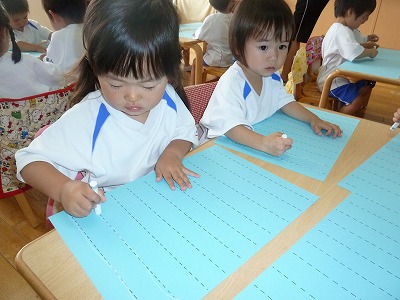 お空からピュー!ポトポトポト♪ 雨が降ってきちゃいました!!白のクレヨンを持って、ピュー!!!みんなで楽しく雨の絵を描いてあそびました☆