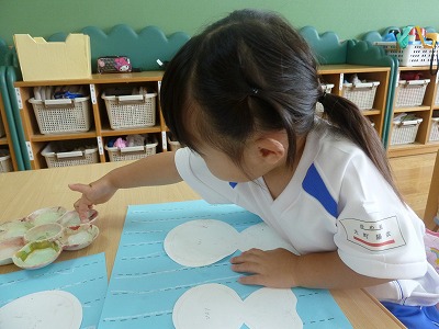 先日描いた雨の絵に、素敵な模様のてるてるぼうずをつけました♪ 「あーしたてんきになあれ・・・☆」かわいいかわいいてるてるぼうずの出来上がりです!!
