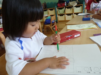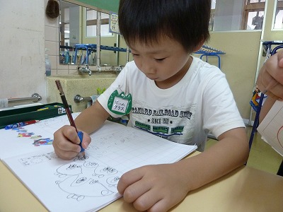 えんぴつを持って何書こうかな~?「バナナ~!!」「まるかけたよ。」と楽しんで書いていました。  年長さんは、文字を書いたり、絵に色をぬったりと一生懸命取り組む姿はかっこよかったです。
