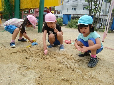 まけずに元気に遊んでいましたよ。お砂遊びではケーキ屋さんごっこ!