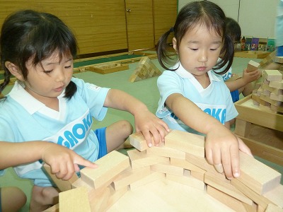 年少にとって初めて園外に出て、つみきをしに行きました。