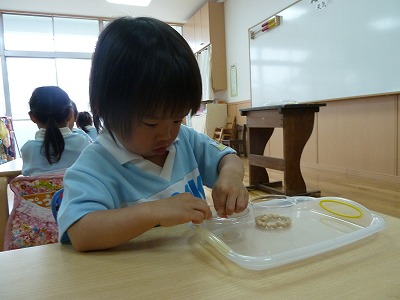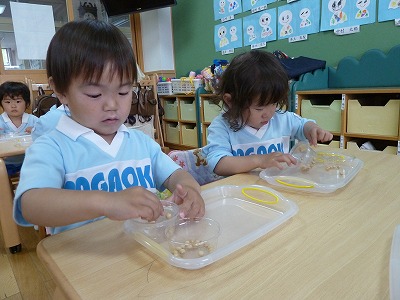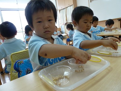 手先を使って、カップの穴に1つずつ豆を入れました。初めはなかなか