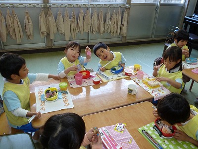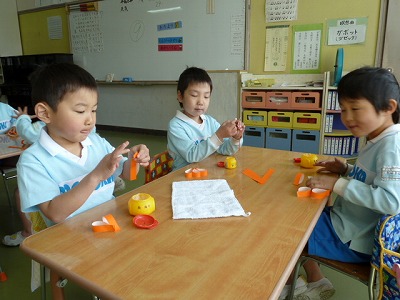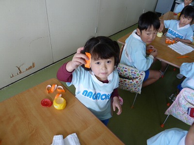 自分の顔を絵の具でぬりました!なんと・・・今回は初めて自分たちで服や髪、顔の色を絵の具でつくりました。絵の具をまぜて・・・水の量にもきをつけて・・・みんなとっても真剣!!!イキイキとした顔になりました♪