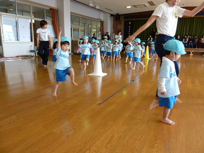 最年少は体育ローテーション、年少はひらひらだこ作り、年中は和久式積み木です☆