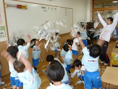 ビリビリちぎって、雪を降らせたり、ボールにしてポーンと投げたり……