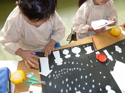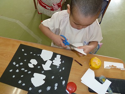 はさみも随分上手に使えるようになった年中さん。半分に折って、切る・・・なんとびっくり家や雪だるまが、対象の形になりました♪白い折り紙を切って黒の画用紙にはって、雪景色のできあがり!!幼稚園にも雪が降らないかな?