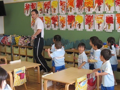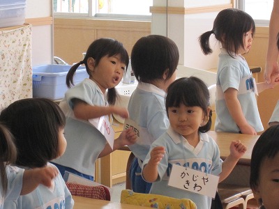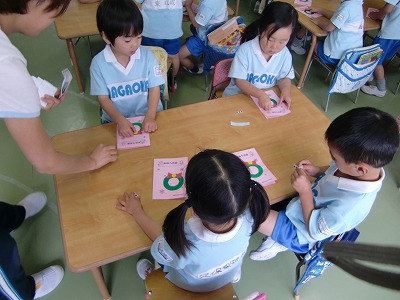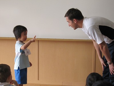 みんなノリノリで歌をうたったり、先生の真似したり、上手に言えた子はお手本でみんなの前で先生と1対1でのやりとり!!ちょっと緊張した様子でしたが、頑張って自分で言うことができていました★また、今日は新しい遊びがをし子どもたちにとって、これからの英語レッスンに楽しみが増えたみたいです。