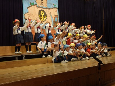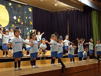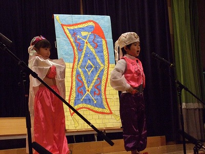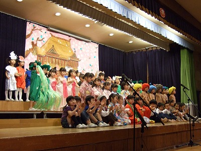 年少・最年少さんはお遊戯。年中さんは今回2クラス合同での昔話『浦島太郎と一寸法師』のオペレッタ。年長は『アラジンと魔法のランプ』と『オズの魔法使い』をしましたよ。年長さんはせりふも堂々と言えていました☆ステージではとってもドキドキしますが、どの学年も持てる力を出して本当によく頑張りました。