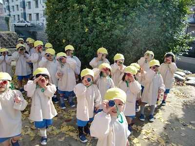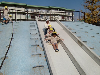 大きなすべり台に大喜びの子どもたち。それからたくさんのいちょうが落ちていてお土産に持って帰っていましたよ♪保育参観で作った望遠鏡も持っていって色んなものを眺めていて、とっても微笑ましかったです。
