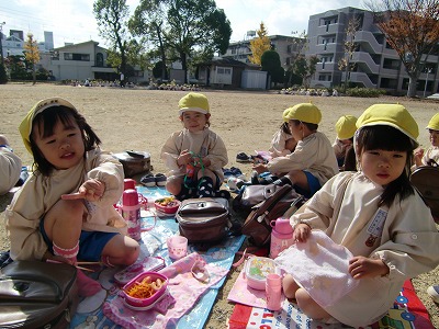 先日、園外散歩に出かけました。年少は初めて東公園にいきました。