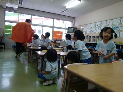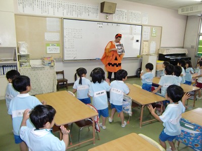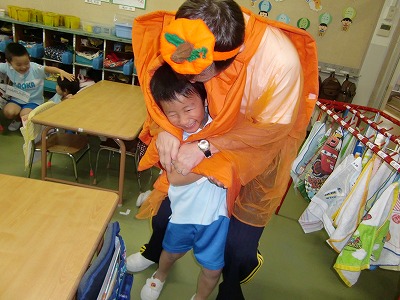 今回はハロウィンが近いということもあり、先生が仮装をしてレッスンをしてくれました。こどもたちは大喜びして、先生に抱きついていました。