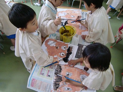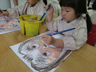年少は、初めて自分の顔に挑戦しましたよ。鼻の穴から順番に1つ1つ丁寧に描きあげました。「色を塗って、生きているみたいにしようね」と話すととてもうれしそうにしていましたよ。あと一歩で完成です☆