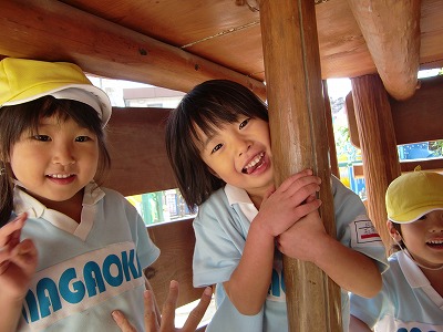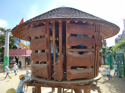 みんなが大好きな遊具の1つ「がき大将」。最年少から年長の子ども達に大人気です!!なかは隠れ家のようになっていて、家族ごっこが行われたり、秘密基地のような場所になっていて、いつもたくさんのこどもたちにで大賑わいです。これからもみんなで仲良く、そして大切に使っていきたいと思います。