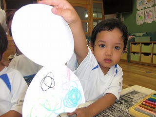 クレヨンで模様と顔を描いて、画用紙にのりでぺったん!!