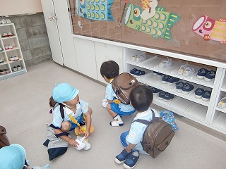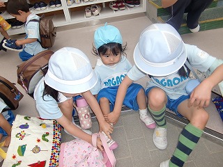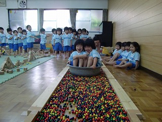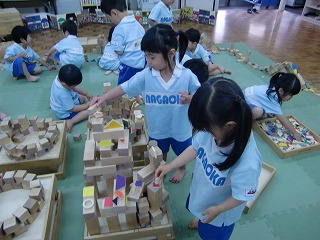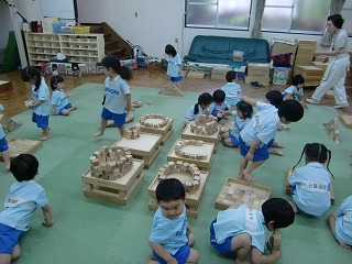 今日ははじめて和久式積み木をしにいきました。幼稚園の外に出るのもこれが初☆みんな2人組で手をつなぎます。正方形を重ねて山を作ったり、色んな形・色のモザイクを飾ったり、みんな真剣そのもの。あまりに集中していたので松永先生も驚いていました。最後はビーズを使ったすべり台にみんな大喜び♪ステキな笑顔が沢山見れました。