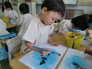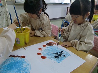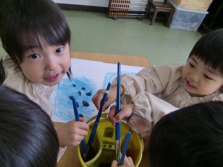 「ぽちゃん♪いい子 いい子!」と言いながら初めて筆を使って絵を書き上げました。おたまじゃくしが逃げないように、池の周りに石を置いているところです。1つ1つ丁寧に頑張りました。みんなの目がとても真剣でした!