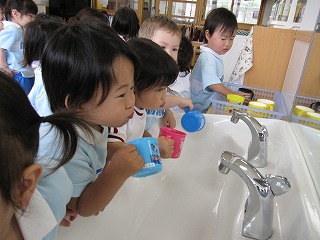 きれいに磨いた後は、口に水を入れグチュグチュグチュ…最後は水を出して、口の中すっきり!!