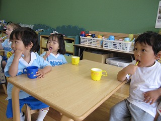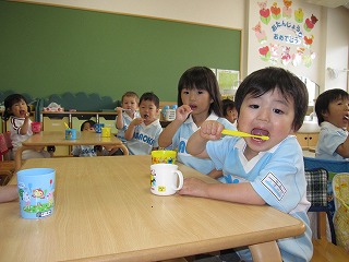 音楽に合わせ、先生の真似をし大きな口でしっかり磨けたかな?
