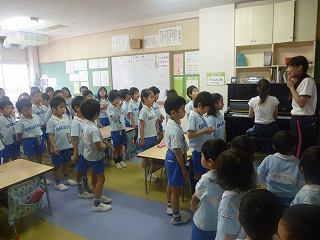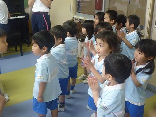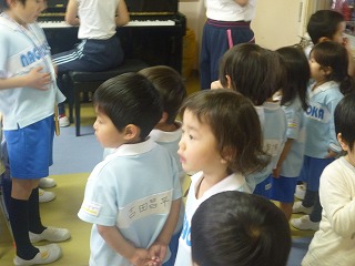今日は初めて、年長さんの教室に、うたの見学をしに行きました♪年長さんのキレイな歌声に、子どもたちも目をくぎ付けにしてみていました。最後は年長さんと一緒に『小鳥のうた』を歌い、とっても良い経験ができたようです(^-^)