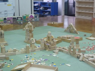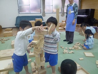 「先生、みてー!!」と、とっても楽しそうに積み木をする子どもたち♪